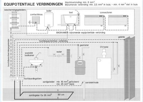 Waterleidingen, gasleidingen en cv leidingen. Aarding in een badruimte potentiaalvereffening met ingang van 1 april 2000 moet de "aarding" in een badruimte aangelegd worden volgens het voorbeeld van figuur 1.