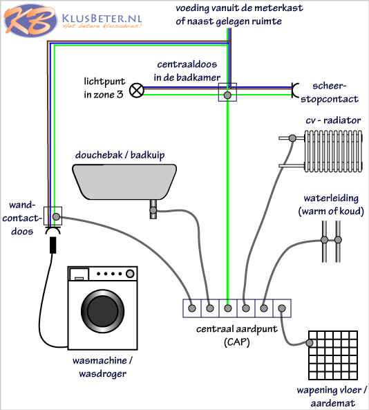 Schakelaar aan de buitenkant van de douche. Tegenwoordig gebruikt men veelal kunststof leidingen voor water voorzieningen. Waterleidingen, gasleidingen en cv leidingen. Dus alle metalen delen (metalen douchebak en radiator wel; De nen1010 spreekt over potentiaalvereffening. Hieronder een overzicht van wat er allemaal geaard dient te worden om … Controleer ook je elektrische installatie bij, aanpassing aan de installatie of bij verhuizing en als u niet zeker weet of u over een goed systeem van aarding beschikt. 701.1.2.2.6 het centrale aardpunt van de badkamer moet rechtstreeks door afzonderlijke koperen draden met een nominale kerndoorsnede van ten minste 4 mm 2 zijn Je hoeft je leidingen niet in de badkamer te aarden maar het mag ook een kamer ernaast zijn, eronder of er boven. Deze lus dient geplaatst te worden.. 701.1.2.2.6 het centrale aardpunt van de badkamer moet rechtstreeks door afzonderlijke koperen draden met een nominale kerndoorsnede van ten minste 4 mm 2 zijn